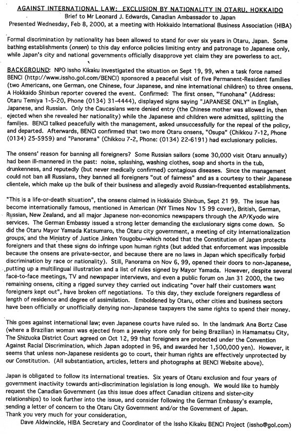 - 2003年4月10日 単行本「ジャパニーズ・オンリー 小樽温泉入浴拒否問題と人種差別」(明石書店、原告 有道 出人 著)が発売。詳しくはここです。