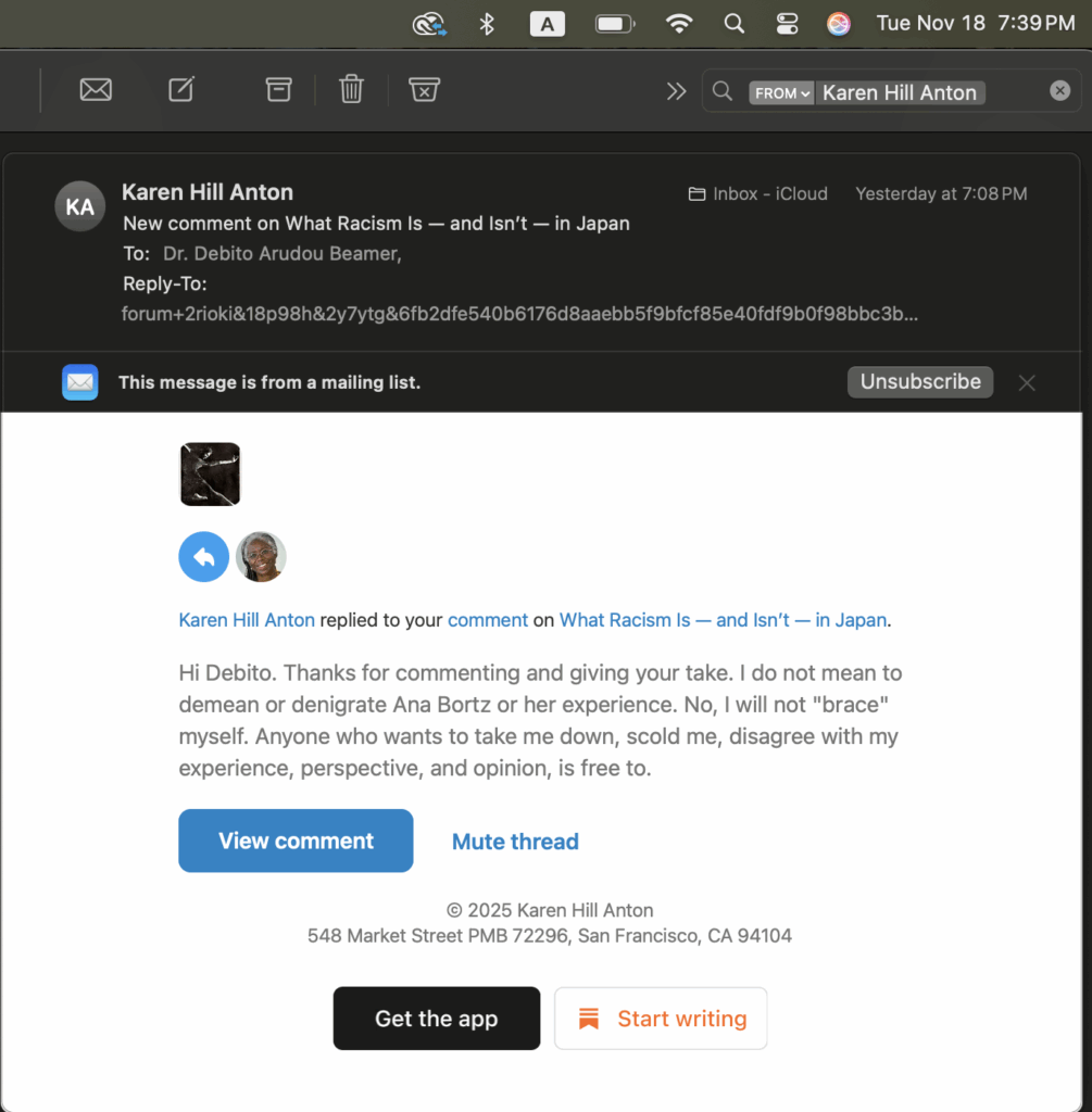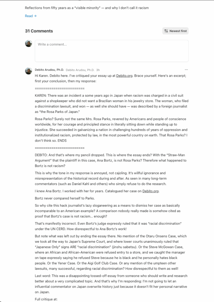 4 comments on “Japan commentator Karen Hill Anton writes on “What Racism is — and isn’t — in Japan” (her Substack, Nov 12, 2025). I critique, as it’s under-researched and willfully ignorant of the historical record. UPDATE: Karen responds on her Substack to say anyone is “free to disagree” with her, then deletes our correspondence from her Substack.
