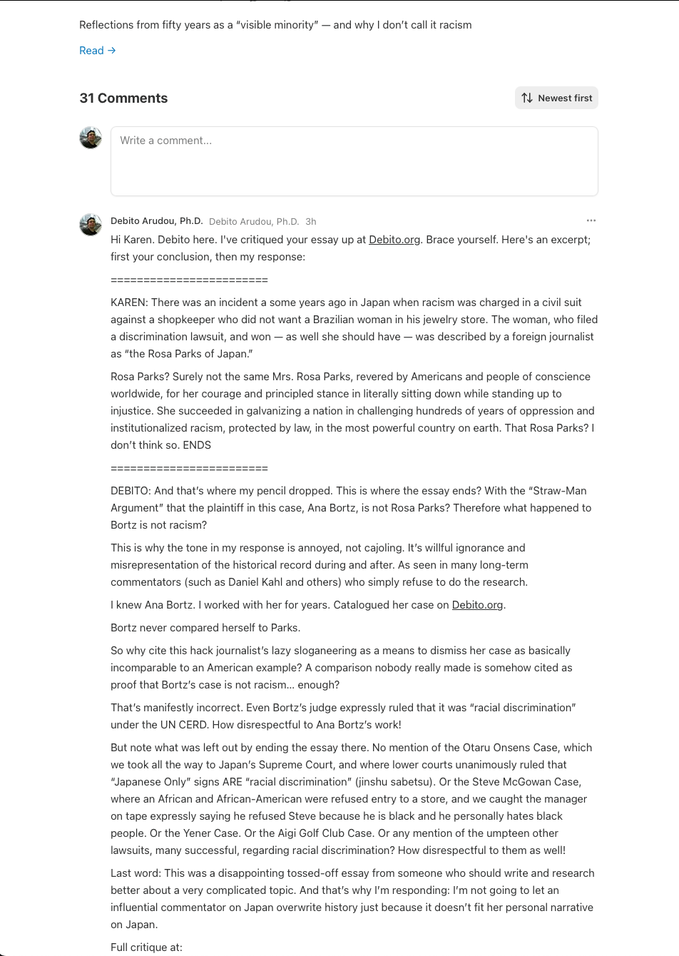 Karen is welcome to her worldview, of course.  But when it becomes a means to ignore (or, in this case, outright delete) history, this isn’t just poor social science.  This is dangerous denialism.  And it deserves to be called out.  Debito Arudou, Ph.D.
