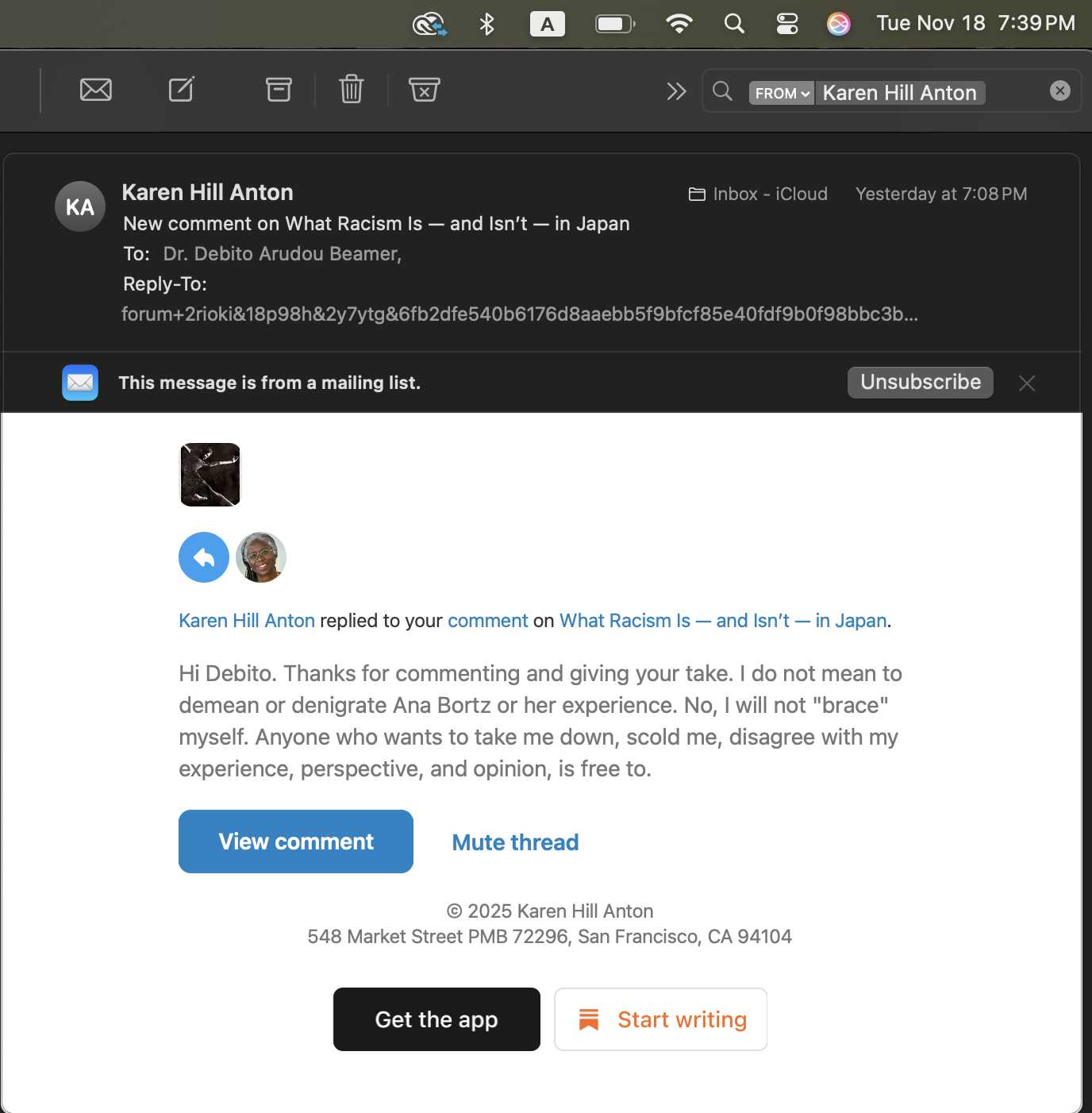 • UPDATE NOV 21, 2025:  Debito here. I responded to Karen.  I posted the conclusion to this essay on Karen’s Substack comments section to this article, with a link back to this page.  Screenshot as evidence: